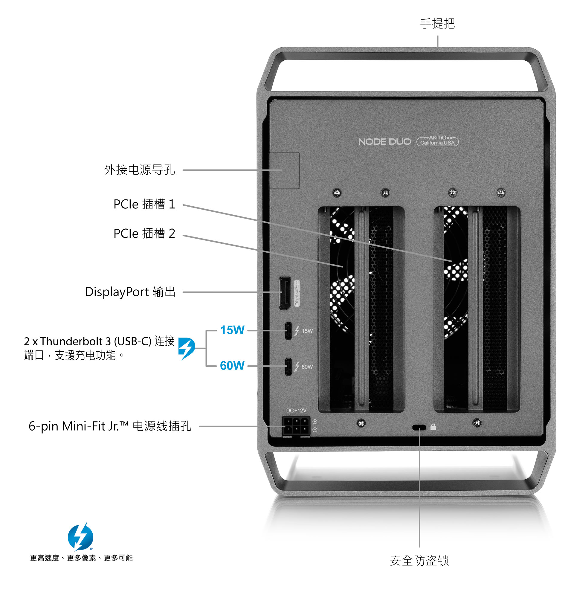艾客优品(AKiTiO) Node Duo 有两个 Thunderbolt 3 连接孔。可以支持 Thunderbolt 3 串接使用(最多可串接5 台装置,外接显卡装置只能放置在第一台使用。),这一代的Thunderbolt 3 兼容了USB 3.1 功能,所以您也可以连接 USB 3.1 Gen2( 10 Gbps)的装置使用,当然一样可以连接 DisplayPort 装置。